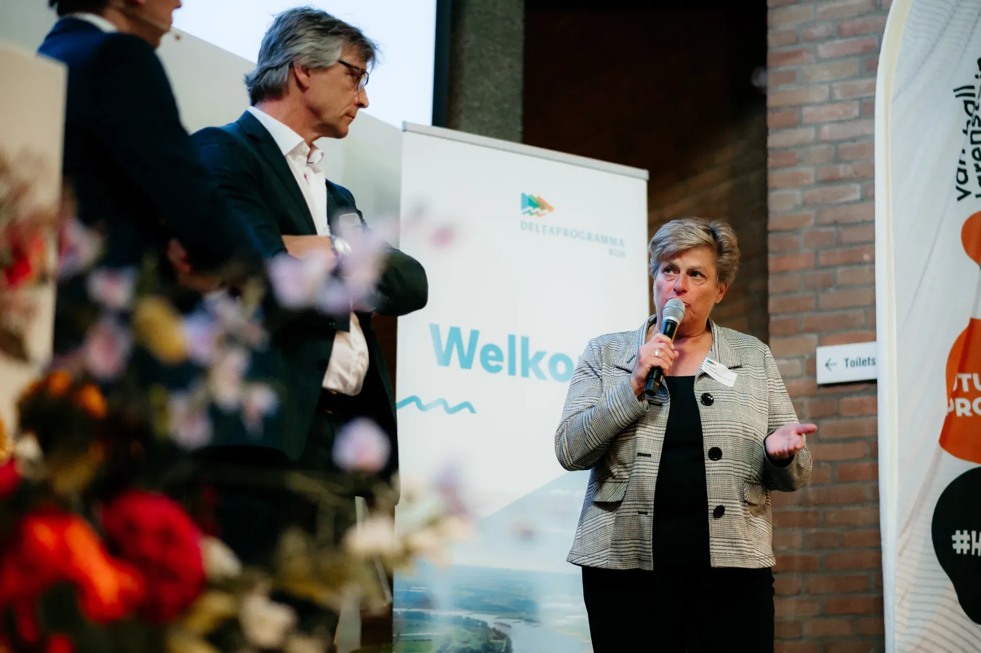 Bestuurders van Deltaprogramma Rijn Nelly Kalfs (voorzitter Nederlandse riviergemeenten) en Dirk-Siert Schoonman (Dijkgraaf Waterschap Drents Overijsselse Delta) reageerden positief op de presentatie van Marieke Hofstra.